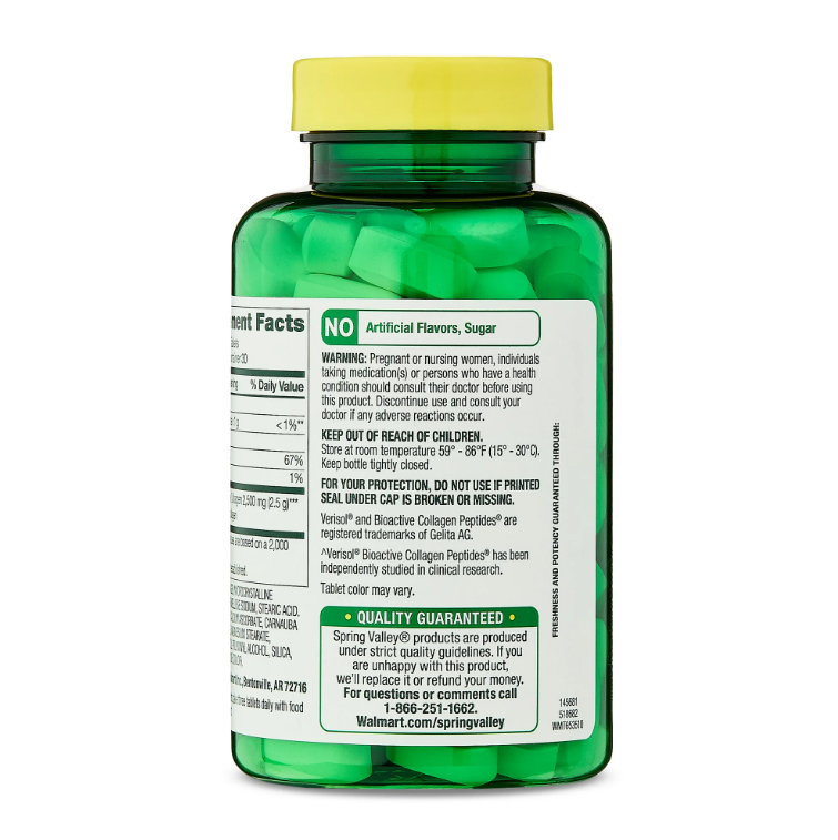 Colágeno hidrolizado con vitamina C de alta absorción Spring Valley. Refuerza piel, cabello, uñas y articulaciones en frasco de 90 tabletas.